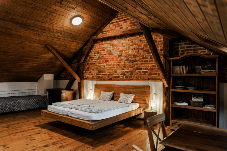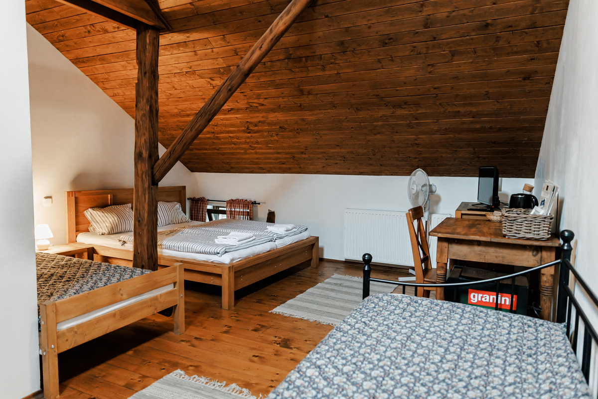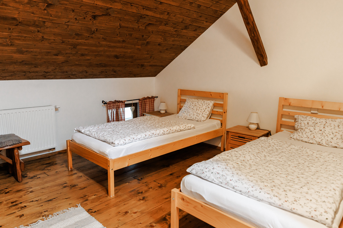 Ubytovací část objektu je umístěna v hlavní budově v podkroví, dříve obytném domě hospodářů. Tato část je nyní zrekonstruována a plně přizpůsobena účelu poskytování ubytovacích služeb. Chceme, abyste se u nás cítili co nejlépe a proto jsem při budování penzionu použili co nejvíce přírodních materiálů jako jsou dřevo a přírodní látky, který společně s doplňky a okolím vytváří příjemnou, útulnou atmosféru.